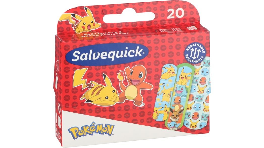 Salvequick Pokémon er populært plaster til aktive børn. Plasteret er fleksibelt, det lader huden ånde og er vand- og smudsafvisende. Hypoallergent.