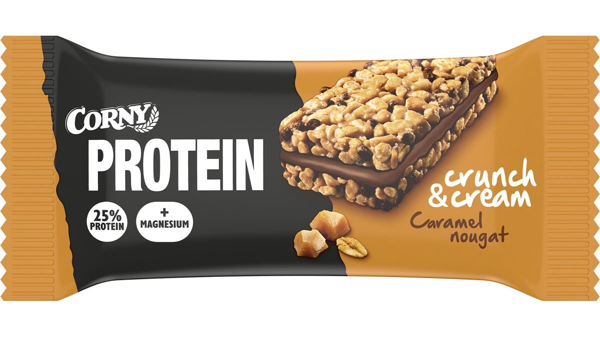 Prøv den nye Corny Crunch & Cream Caramel Nougat, en super velsmagende proteinbar i tre lag. Uimodståelige sprøde krispies kombineret med et cremet karamel- og nougatfyld er en uovertruffen kombination. Hver bar indeholder 25% protein og er desuden beriget med magnesium, som bidrager til normal muskelfunktion. Corny Crunch & Cream Caramel Nougat er den perfekte snack mellem måltiderne, eller når du er på farten og har brug for noget ekstra protein.