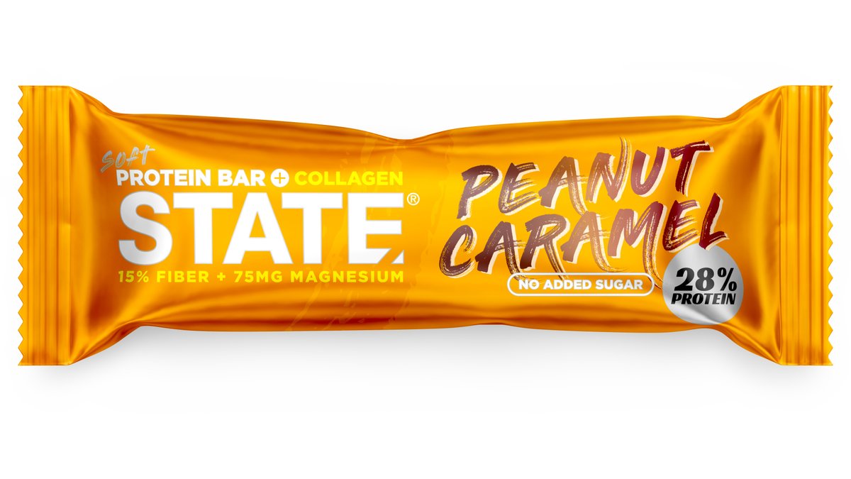 Tag godt imod STATE’s helt nye og vilde proteinbarer! Peanut/Caramel er med et meget højt fiberindhold (15%) og indeholder hele 28% protein (14 gram pr. bar) hvoraf de 12% af proteinet kommer fra kollagen, svarende til 6 gram pr. bar. Det resterende proteinindhold kommer fra både ærteprotein og mælkeprotein. Til sidst er der tilsat 75 mg magnesium, for at bidrage til en normal proteinsyntese og elektrolytbalance.