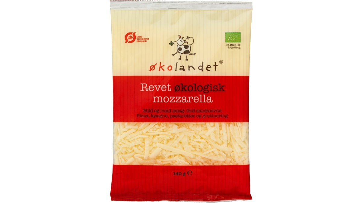 Revet økologisk mozzarella. Mild og rund smag. God smelteevne. Pizza, lasagne, pastaretter og gratinering.