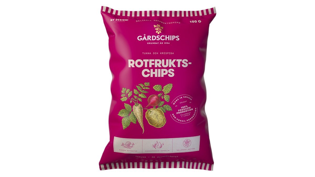 Gårdschips’ rodfrugtchips er smagen af natur. Chipsene er fremstillet af rodfrugter fra Halland og Sydsverige, stegt i svensk rapsolie og saltet let. De er veganske. Hos svenske Gårdschips anvender de udelukkende hallandske kartofler, som de omhyggeligt frituresteger i små portioner. Derefter krydrer de chipsene med smage fra hele verden. De kalder det hele for “hallandsk håndværk”.
