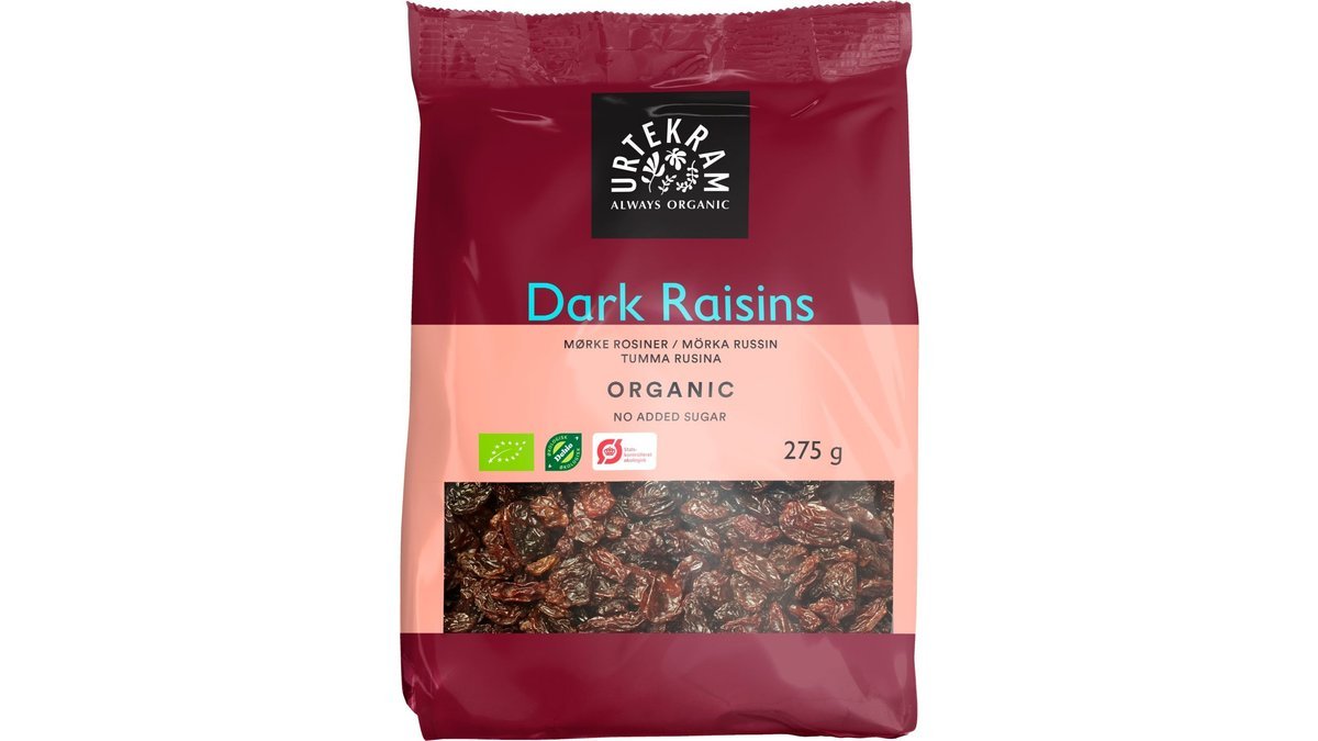 Urtekram mørke rosiner af sorten, hompson Seedless, starter livet på vinstokkene som saftige, grønne druer. Helt naturligt med solens hjælp ender de dog som mørke skønheder. Spis dem som snack eller bland dem f.eks. med hele mandler, kanel og rålakridspulver.
