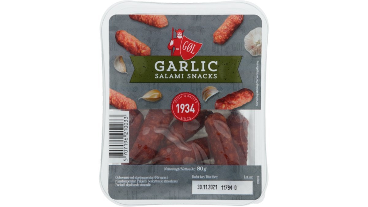 GØL garlic salami snack er en sikker vinder hos dem med smag for det let krydrede køkken. Snacken smager fabelagtigt til enhver festlig lejlighed, men kan også anvendes som inspiration på tapasbordet, på pølsebordet, som en snack mens du griller, inden aftensmåltidet eller på farten.