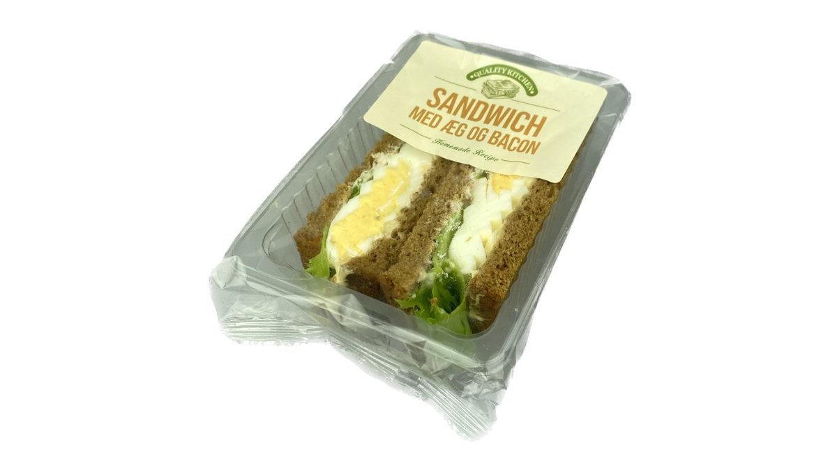 Sandwich med æg, bacon, æggesalat og peberdressing fra Quality Kitchen. Klar til at spise. Nemt og lækkert – velbekomme.