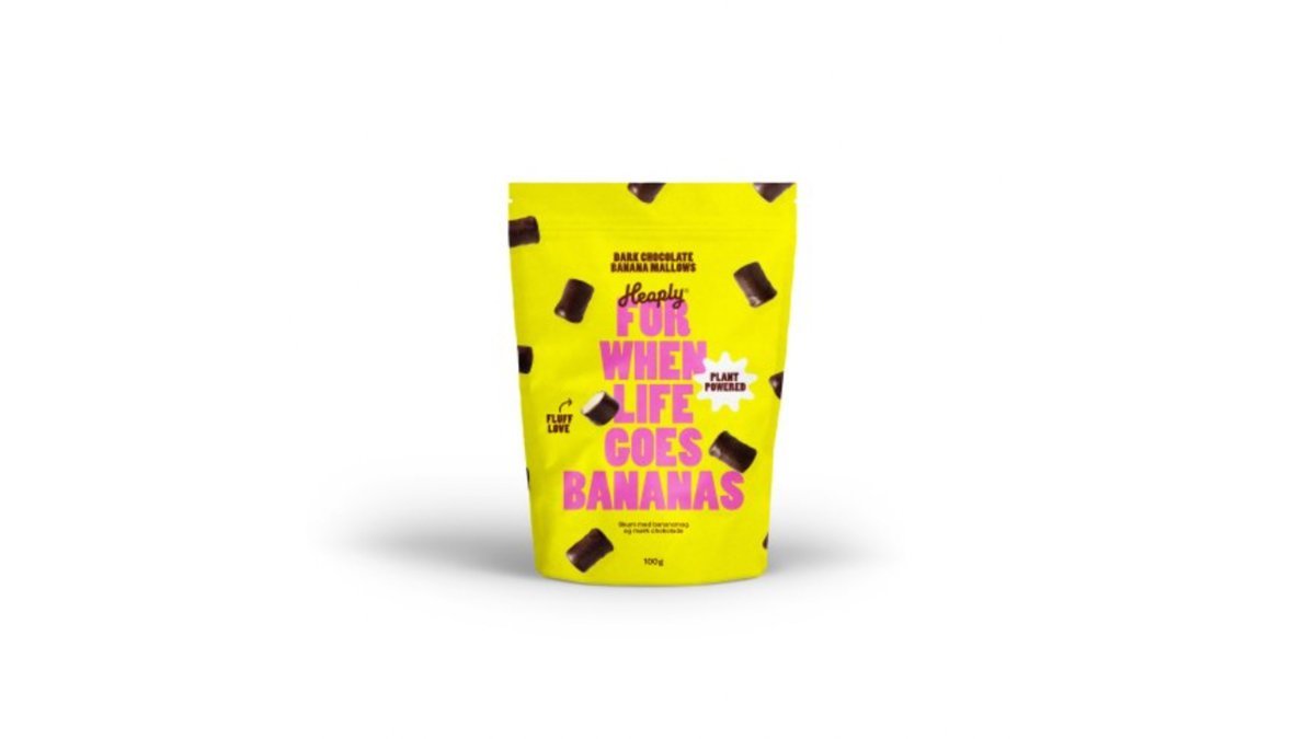 Plantebaserede skumfiduser med banansmag overtrukket med en lækker mørk chokolade fra Heaply.