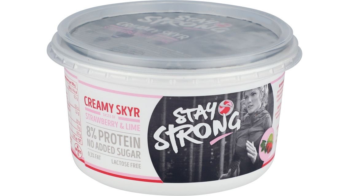 Denne variant af Stay Strong Cremet Skyr er laktosefri og har en dejlig frisk smag af jordbær og lime. Tilmed er den uden tilsat sukker, men indeholder sødestoffer samt naturligt sukker fra mælken.
