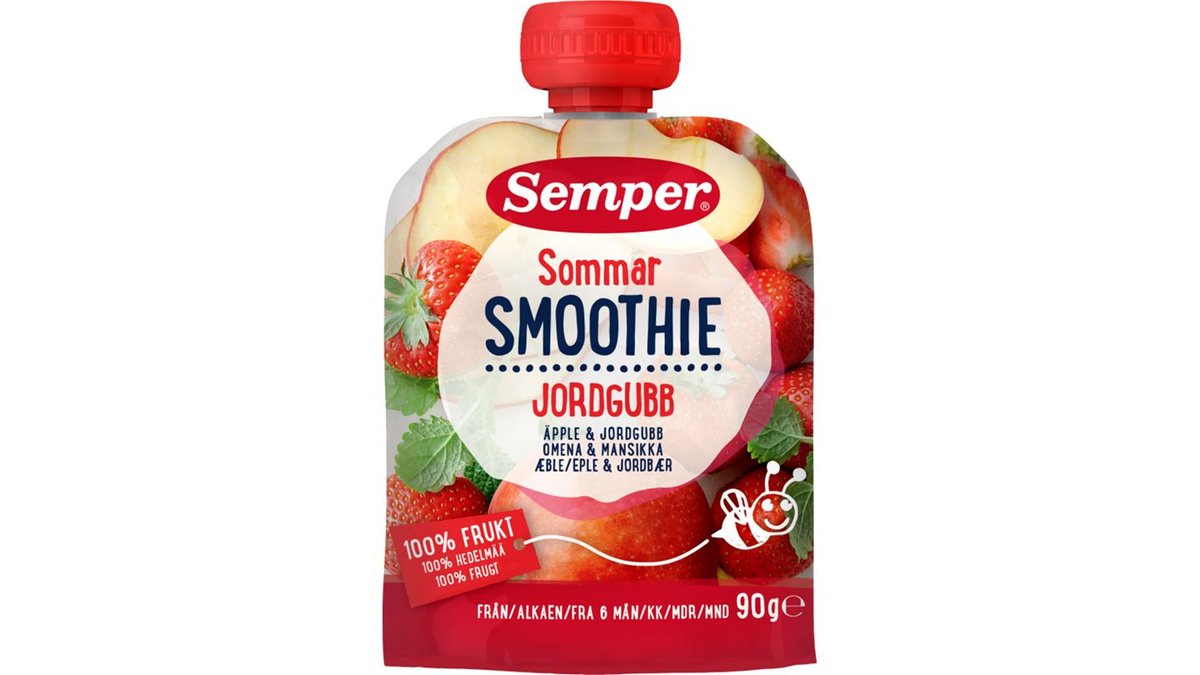 God babyvenlig frugtmos i klempose med 100% frugt. Semper Smoothie Sommer med æble & jordbær er en blød og cremet frugtpuré. Passer godt til smagsportioner, når baby begynder at spise rigtig mad, senere som dessert eller mellemmåltid. Serveres på ske.