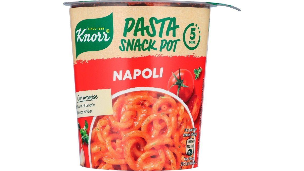 Den lækreste smag af tomat findes i denne snack. Knorr Snack Pot Napoli er en velegnet snack til at stille sulten, og det eneste den kræver er kogende vand og fem minutters hviletid.