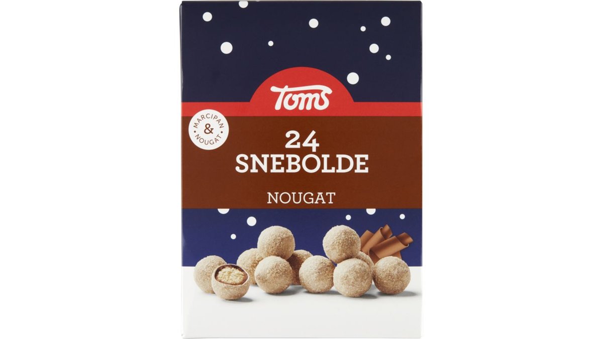 Et twist på de klassiske snebolde – nu med nougat – fra Toms. Sneboldene er lavet af marcipan (38%) med nougat (27%), mørk chokolade (7%) og sukkerdragée (28%). En perfekt julesnack til ethvert julebord.