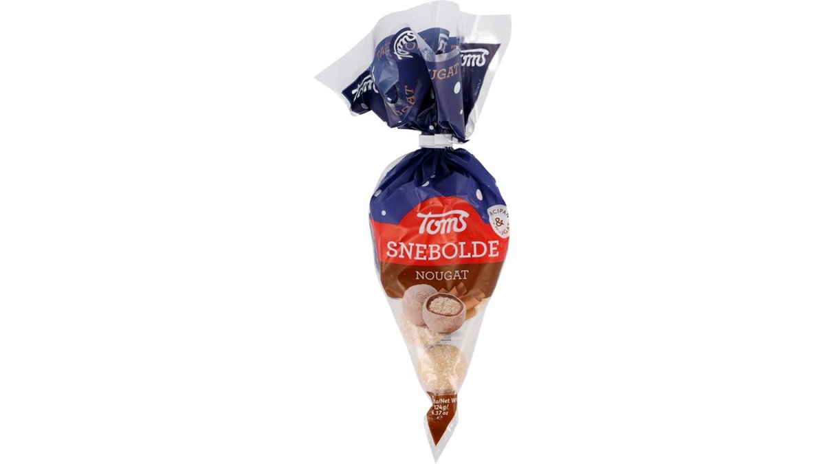 Et twist på de klassiske snebolde – nu med nougat – fra Toms. Sneboldene er lavet af marcipan (38%) med nougat (27%), mørk chokolade (7%) og sukkerdragée (28%). En perfekt julesnack til ethvert julebord.