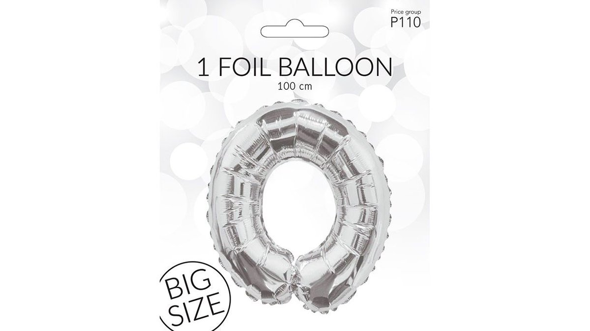 Folieballon i sølv af tallet 0. Måler 100cm.