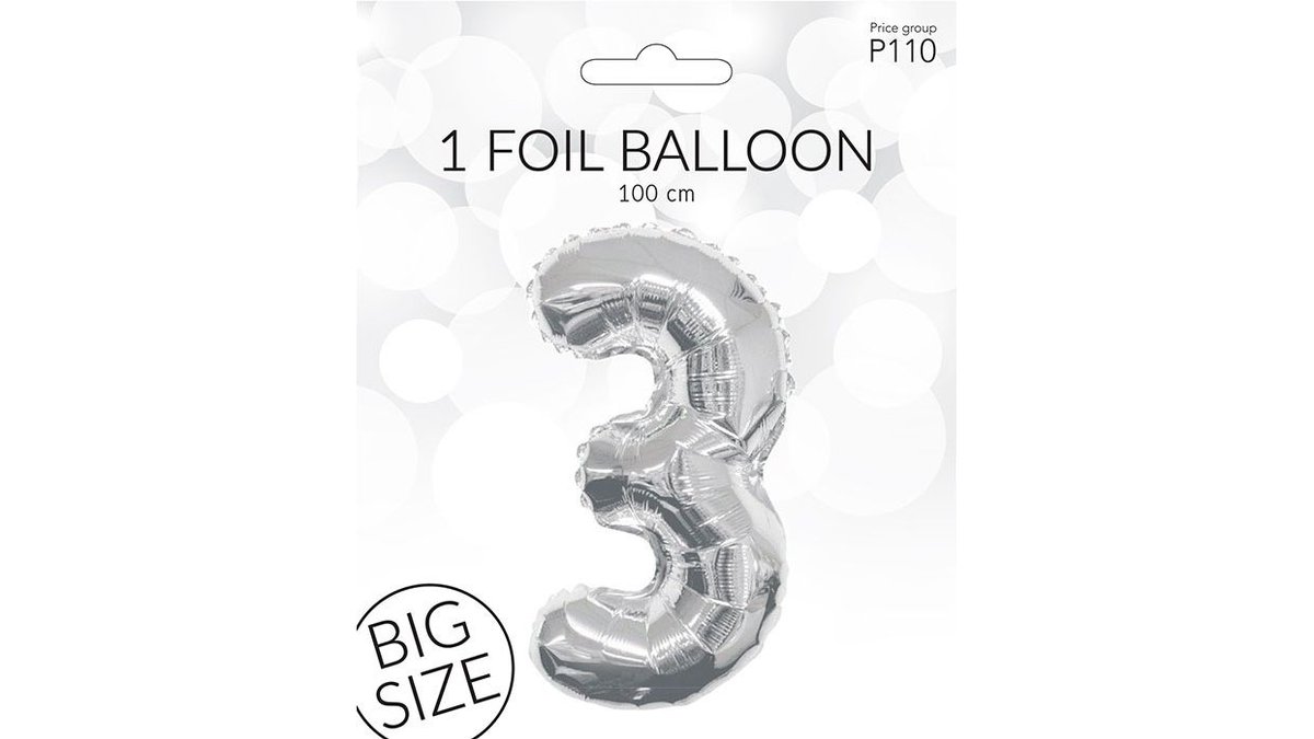 Folieballon i sølv af tallet 3. Måler 100cm.