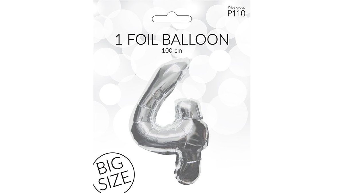 Folieballon i sølv af tallet 4. Måler 100cm.