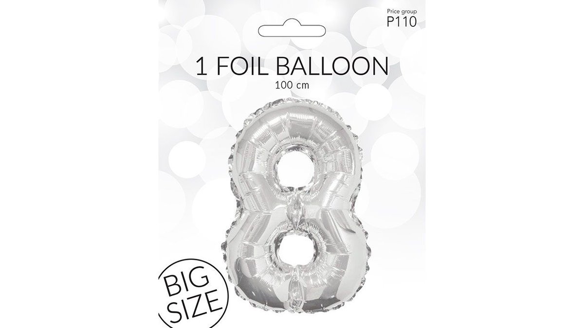 Folieballon i sølv af tallet 8. Måler 100cm.