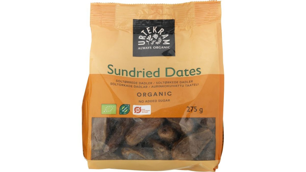 Urtekram økologisk soltørrede dadler er tørret i solen, så du kan nyde smagen ekstra meget. Dadlerne er uden tilsat sukker og er veganske. De kan nydes som snack eller lav lækkert ymerdrys med hakkede dadler og nødder, evt. blandet med fuldkornsflager, kakaopulver og lidt appelsinsaft. Kan også anvendes som en erstatning for slikposen eller koges til en sød frugtgrød. Skåret i små stykker og drysset oven på mysli, flakes, grød eller yoghurt. Urtekrams soltørrede dadler er uundværlige i konfekten til jul. Giver også hjemmebagte boller et sødt pift. Enkelte hårde partikler kan forekomme.