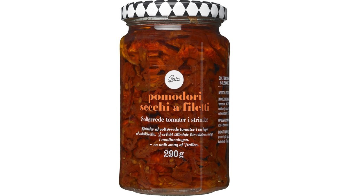| Ingrediensliste | 53 % soltørrede tomater, 43 % solsikkeolie, 2 % salt, eddike (indeholder SULFITTER), sukker, antioxidant (E 300). |