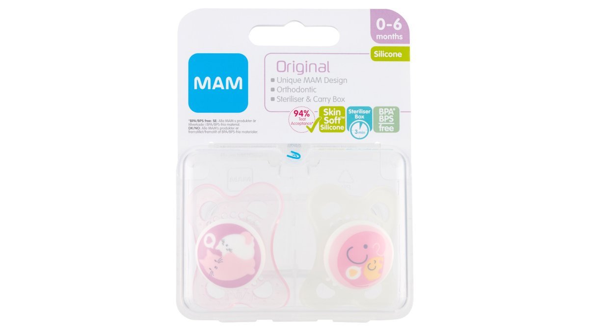 MAM Original sutter har store lufthuller og små knopper på indersiden, så huden hele tiden tilføres luft. Suttedelen er lavet i silikone.