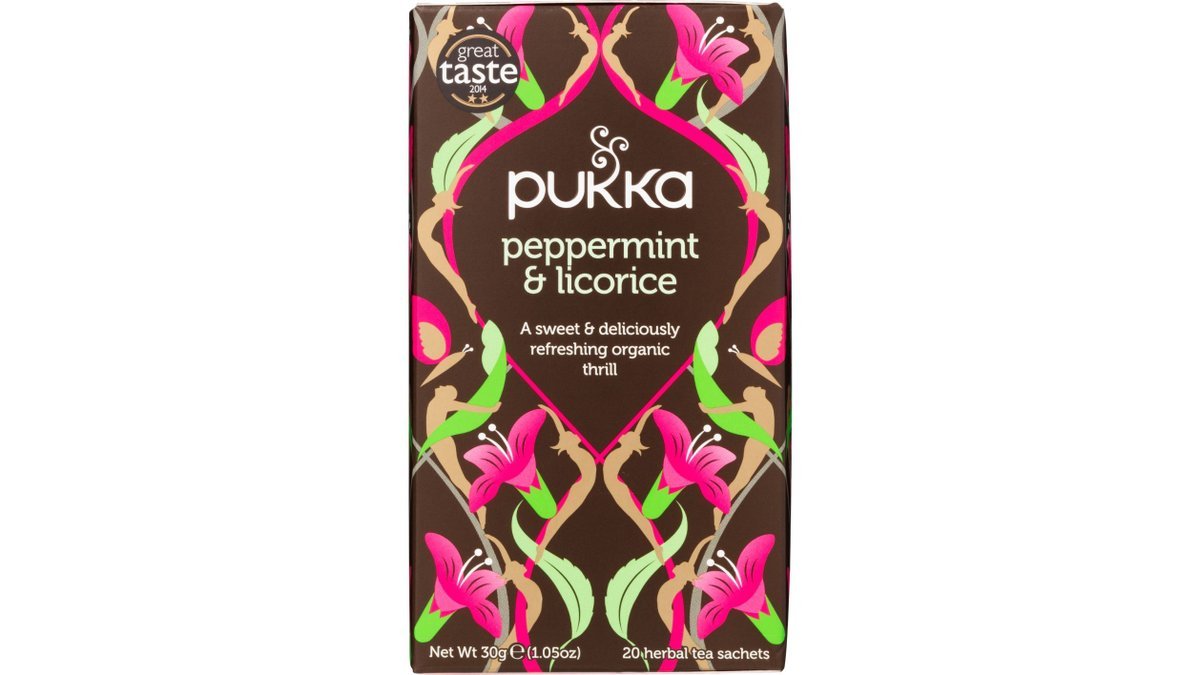Økologisk Peppermint & Licorice fra Pukka er en urtete med en skøn smag.