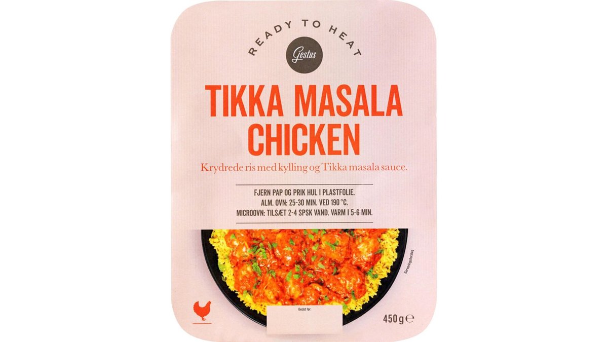 | Ingrediensliste | 47% krydrede kogte ris (vand, ris, krydderier, salt, rapsolie, farvestof (E 101)), 16% kogt kylling (heraf 93% kyllingekød, tapiokastivelse, salt, dextrose), løg, vand, tomatkoncentrat, tomat, yoghurt, vegetabilske olie (solsikke, raps), sukker, krydderier, hvidløg, glukosesirup, kokosekstrakt, modificeret majsstivelse, salt, krydderiekstrakter, fennikel, mælkeprotein, eddike. |