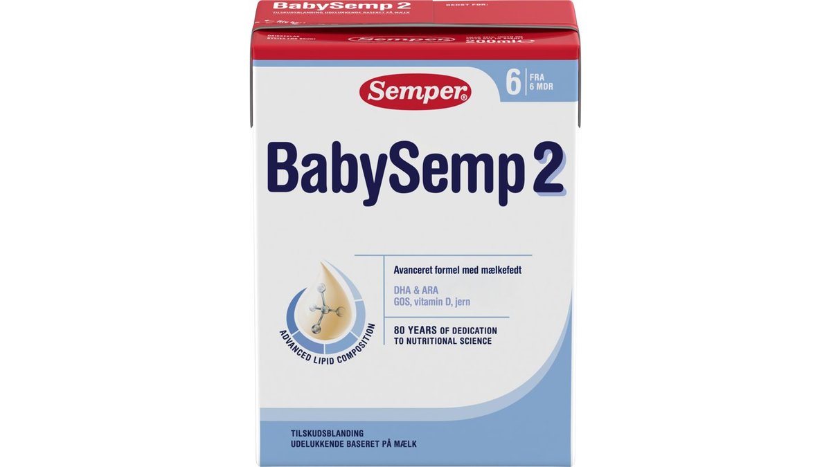 BabySemp 2 drikkeklar er den eneste tilskudsblanding i Danmark der indeholder en nøje udvalgt blanding af mælkefedt og vegetabilsk olie, BabySemp 2 er beriget med 1,0 mg jern/100 ml færdigt produkt og er desuden beriget med jod og D-vitamin i overensstemmelse med den danske lovgivning. BabySemp 2 drikkeklar indeholder 1,5 µg D vitamin/100 ml færdigblanding. Det betyder, at børn der får 800 ml eller mere af BabySemp 2 drikkeklar IKKE skal have D-vitamintilskud. BabySemp 2 drikkeklar indeholder også den præbiotiske kostfibre GOS (galaktooligosakkarider).