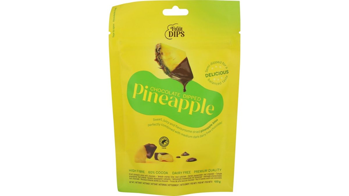 Søde, saftige og smagfulde tørrede ananas stykker perfekt kombineret med medium mørk mælkefri chokolade. En lækker snacks til den lille sult.