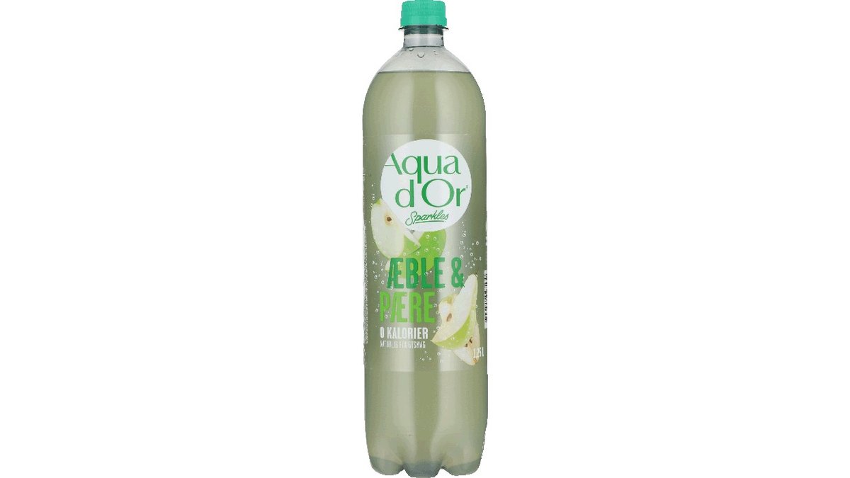Læskedrik med pære og æble fra Aqua D’or Sparkles. Smagfuld læskedrik med naturligt mineralvand, tilsat blide bobler og naturlig frugtsmag. Indeholder ingen kalorier, ingen sukker og er lokalt tappet i Fasterholt. Flasken er lavet af 100% genbrugsplast.
