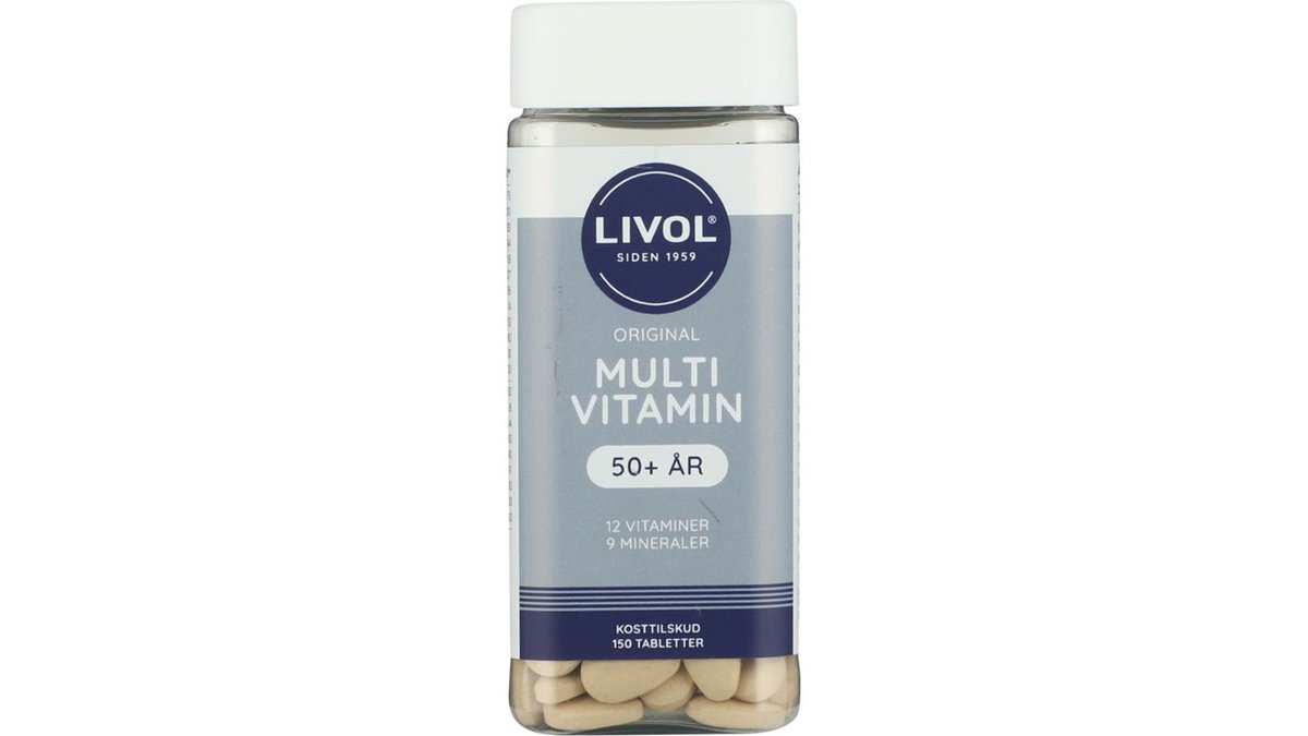 Synkevenlige tabletter. Livol Multi Vitamin 50+ år er specielt til dig over 50 år. Indeholder vitaminer og mineraler, der hjælper til, at mindske træthed og udmattelse*, immunsystemets normale funktion**, samt vedligeholdelse af normale knogler***. Pantothensyre hjælper til en normal mental ydeevne. A-vitamin, riboflavin og zink hjælper til at vedligeholde et normalt syn. Thiamin hjælper til normal hjertefunktion. Synkevenlig tabletform. *(Riboflavin, vitamin B6, B12 og C, folsyre, niacin, pantothensyre, magnesium, jern). **(vitamin A, B6 og B12, C, D, jern, zink og kobber). ***(vitamin D, magnesium og zink). Produktet er udviklet i Danmark. Bøtten er fremstillet af recirkuleret PET.