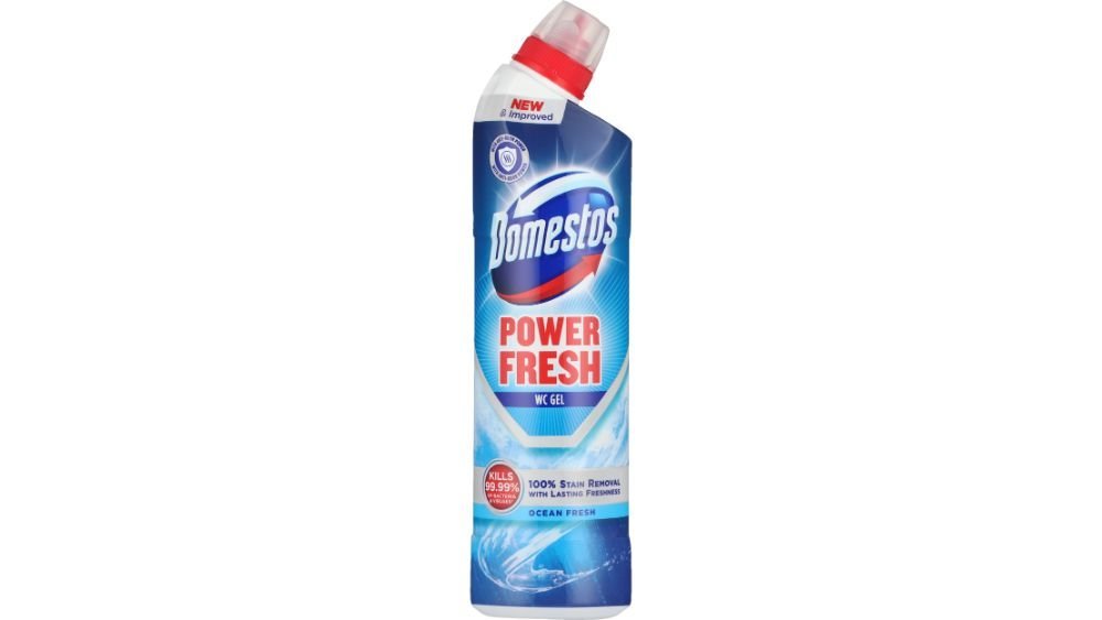 Domestos Power Fresh Ocean er et gelbaseret toiletrensemiddel med kalkfjerner og det har et innovativt multijet mundstykke med 7 huller, som gør, at det kan rengøre selv de mest svært tilgængelige overflader.